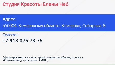 Студия Красоты Елены Неб по адресу 650004, Кемеровская область, Кемерово, Соборная, 8 в дальнейшем Организация, размещена в следующих категориях: