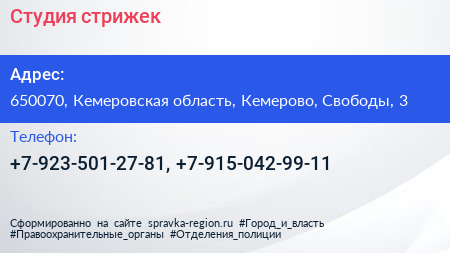 Студия стрижек по адресу 650070, Кемеровская область, Кемерово, Свободы, 3 в дальнейшем Организация, размещена в следующих категориях: