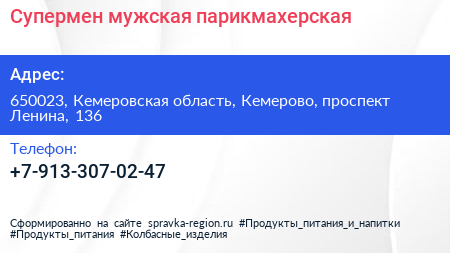 Супермен, мужская парикмахерская по адресу 650023, Кемеровская область, Кемерово, проспект Ленина, 136 в дальнейшем Организация, размещена в следующих категориях:
