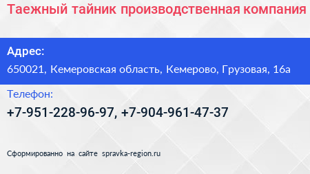 Таежный тайник, производственная компания по адресу 650021, Кемеровская область, Кемерово, Грузовая, 16а в дальнейшем Организация, размещена в следующих категориях: