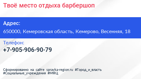Твоё место отдыха, барбершоп по адресу 650000, Кемеровская область, Кемерово, Весенняя, 18 в дальнейшем Организация, размещена в следующих категориях: