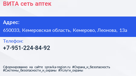 ВИТА, сеть аптек по адресу 650033, Кемеровская область, Кемерово, Леонова, 13а в дальнейшем Организация, размещена в следующих категориях: