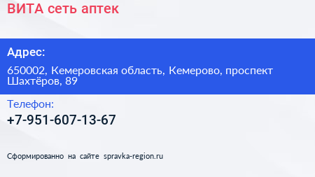 ВИТА, сеть аптек по адресу 650002, Кемеровская область, Кемерово, проспект Шахтёров, 89 в дальнейшем Организация, размещена в следующих категориях:
