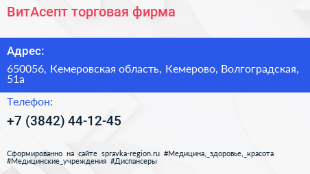 ВитАсепт, торговая фирма по адресу 650056, Кемеровская область, Кемерово, Волгоградская, 51а в дальнейшем Организация, размещена в следующих категориях: