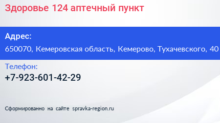 Здоровье 124, аптечный пункт по адресу 650070, Кемеровская область, Кемерово, Тухачевского, 40 в дальнейшем Организация, размещена в следующих категориях: