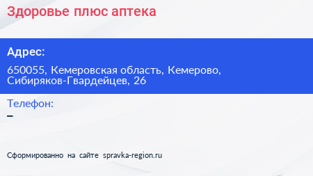 Здоровье плюс, аптека по адресу 650055, Кемеровская область, Кемерово, Сибиряков-Гвардейцев, 26 в дальнейшем Организация, размещена в следующих категориях: