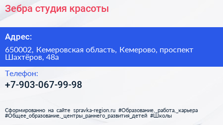 Зебра, студия красоты по адресу 650002, Кемеровская область, Кемерово, проспект Шахтёров, 48а в дальнейшем Организация, размещена в следующих категориях: