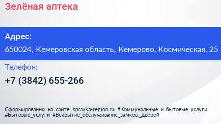 Зелёная, аптека по адресу 650024, Кемеровская область, Кемерово, Космическая, 25 в дальнейшем Организация, размещена в следующих категориях: