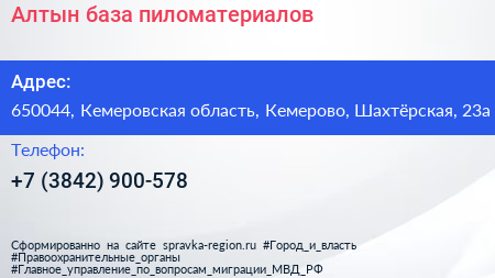 Алтын, база пиломатериалов по адресу 650044, Кемеровская область, Кемерово, Шахтёрская, 23а в дальнейшем Организация, размещена в следующих категориях: