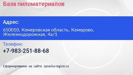 База пиломатериалов по адресу 650010, Кемеровская область, Кемерово, Железнодорожная, 4а/1 в дальнейшем Организация, размещена в следующих категориях: