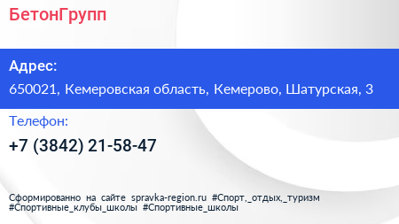 БетонГрупп по адресу 650021, Кемеровская область, Кемерово, Шатурская, 3 в дальнейшем Организация, размещена в следующих категориях: