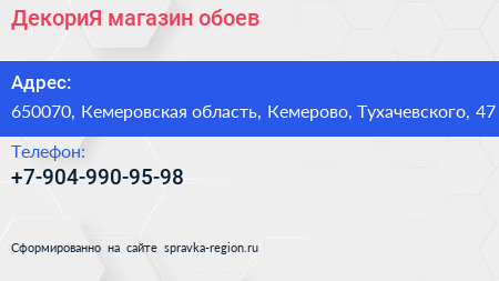 ДекориЯ, магазин обоев по адресу 650070, Кемеровская область, Кемерово, Тухачевского, 47 в дальнейшем Организация, размещена в следующих категориях: