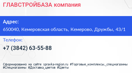 ГЛАВСТРОЙБАЗА, компания по адресу 650040, Кемеровская область, Кемерово, Дружбы, 43/1 в дальнейшем Организация, размещена в следующих категориях: