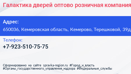 Галактика дверей, оптово-розничная компания по адресу 650036, Кемеровская область, Кемерово, Терешковой, 39д в дальнейшем Организация, размещена в следующих категориях: