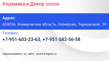 Керамика и Декор, салон по адресу 650036, Кемеровская область, Кемерово, Терешковой, 39 в дальнейшем Организация, размещена в следующих категориях: