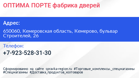 ОПТИМА ПОРТЕ, фабрика дверей по адресу 650060, Кемеровская область, Кемерово, бульвар Строителей, 26 в дальнейшем Организация, размещена в следующих категориях: