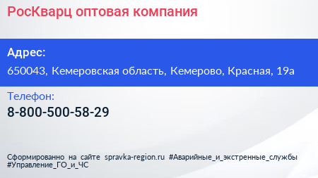 РосКварц, оптовая компания по адресу 650043, Кемеровская область, Кемерово, Красная, 19а в дальнейшем Организация, размещена в следующих категориях: