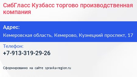 СибГласс-Кузбасс, торгово-производственная компания по адресу Кемеровская область, Кемерово, Кузнецкий проспект, 17 в дальнейшем Организация, размещена в следующих категориях:
