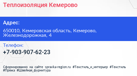 Теплоизоляция Кемерово по адресу 650010, Кемеровская область, Кемерово, Железнодорожная, 4 в дальнейшем Организация, размещена в следующих категориях: