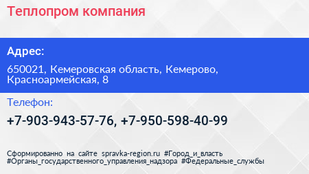 Теплопром, компания по адресу 650021, Кемеровская область, Кемерово, Красноармейская, 8 в дальнейшем Организация, размещена в следующих категориях: