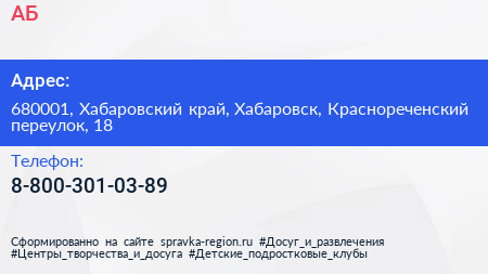 АБ по адресу 680001, Хабаровский край, Хабаровск, Краснореченский переулок, 18 в дальнейшем Организация, размещена в следующих категориях: