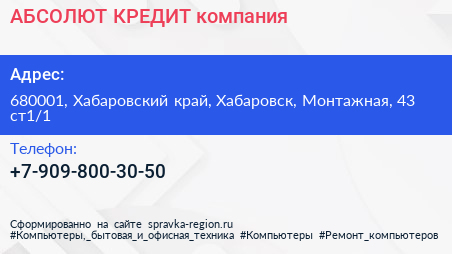 АБСОЛЮТ КРЕДИТ, компания по адресу 680001, Хабаровский край, Хабаровск, Монтажная, 43 ст1/1 в дальнейшем Организация, размещена в следующих категориях: