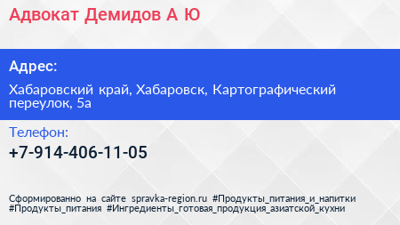 Адвокат Демидов А.Ю. по адресу Хабаровский край, Хабаровск, Картографический переулок, 5а в дальнейшем Организация, размещена в следующих категориях: