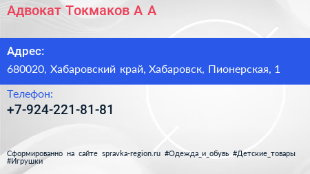 Адвокат Токмаков А.А. по адресу 680020, Хабаровский край, Хабаровск, Пионерская, 1 в дальнейшем Организация, размещена в следующих категориях:
