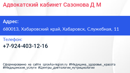 Адвокатский кабинет Сазонова Д.М. по адресу 680013, Хабаровский край, Хабаровск, Служебная, 11 в дальнейшем Организация, размещена в следующих категориях: