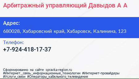 Арбитражный управляющий Давыдов А.А. по адресу 680028, Хабаровский край, Хабаровск, Калинина, 123 в дальнейшем Организация, размещена в следующих категориях: