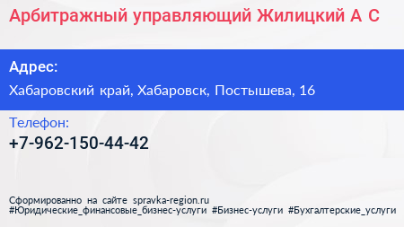 Арбитражный управляющий Жилицкий А.С. по адресу Хабаровский край, Хабаровск, Постышева, 16 в дальнейшем Организация, размещена в следующих категориях: