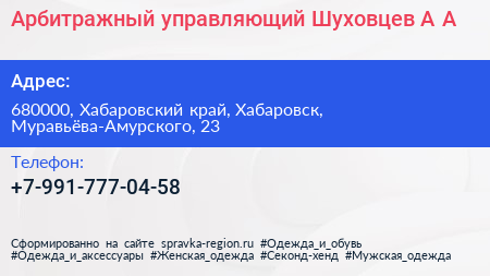 Арбитражный управляющий Шуховцев А.А. по адресу 680000, Хабаровский край, Хабаровск, Муравьёва-Амурского, 23 в дальнейшем Организация, размещена в следующих категориях: