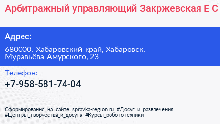 Арбитражный управляющий Закржевская Е.С. по адресу 680000, Хабаровский край, Хабаровск, Муравьёва-Амурского, 23 в дальнейшем Организация, размещена в следующих категориях: