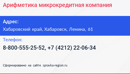 Арифметика, микрокредитная компания по адресу Хабаровский край, Хабаровск, Ленина, 61 в дальнейшем Организация, размещена в следующих категориях: