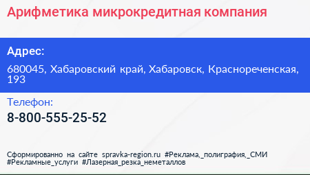 Арифметика, микрокредитная компания по адресу 680045, Хабаровский край, Хабаровск, Краснореченская, 193 в дальнейшем Организация, размещена в следующих категориях: