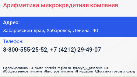 Арифметика, микрокредитная компания по адресу Хабаровский край, Хабаровск, Ленина, 40 в дальнейшем Организация, размещена в следующих категориях: