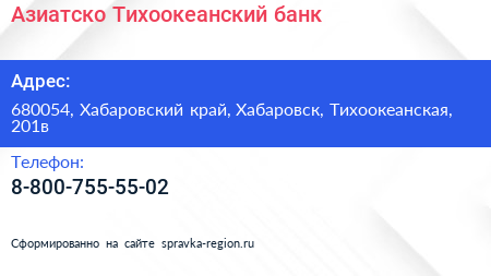 Азиатско-Тихоокеанский банк по адресу 680054, Хабаровский край, Хабаровск, Тихоокеанская, 201в в дальнейшем Организация, размещена в следующих категориях: