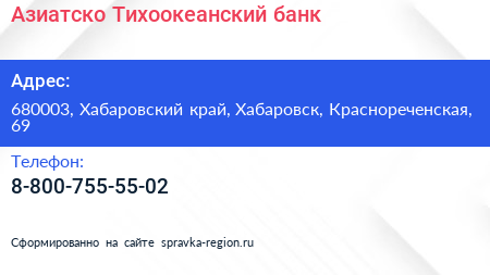 Азиатско-Тихоокеанский банк по адресу 680003, Хабаровский край, Хабаровск, Краснореченская, 69 в дальнейшем Организация, размещена в следующих категориях: