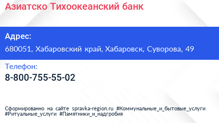 Азиатско-Тихоокеанский банк по адресу 680051, Хабаровский край, Хабаровск, Суворова, 49 в дальнейшем Организация, размещена в следующих категориях: