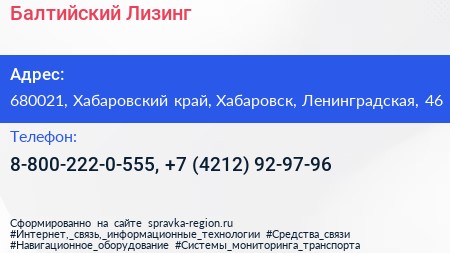 Балтийский Лизинг по адресу 680021, Хабаровский край, Хабаровск, Ленинградская, 46 в дальнейшем Организация, размещена в следующих категориях: