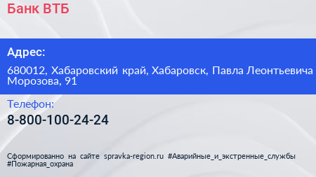 Банк ВТБ по адресу 680012, Хабаровский край, Хабаровск, Павла Леонтьевича Морозова, 91 в дальнейшем Организация, размещена в следующих категориях: