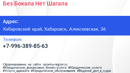 Без Бокала Нет Шагала по адресу Хабаровский край, Хабаровск, Алексеевская, 36 в дальнейшем Организация, размещена в следующих категориях: