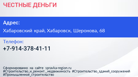 ЧЕСТНЫЕ ДЕНЬГИ по адресу Хабаровский край, Хабаровск, Шеронова, 68 в дальнейшем Организация, размещена в следующих категориях: