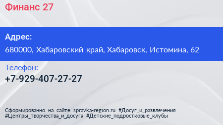 Финанс 27 по адресу 680000, Хабаровский край, Хабаровск, Истомина, 62 в дальнейшем Организация, размещена в следующих категориях:
