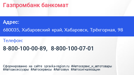 Газпромбанк, банкомат по адресу 680035, Хабаровский край, Хабаровск, Трёхгорная, 98 в дальнейшем Организация, размещена в следующих категориях: