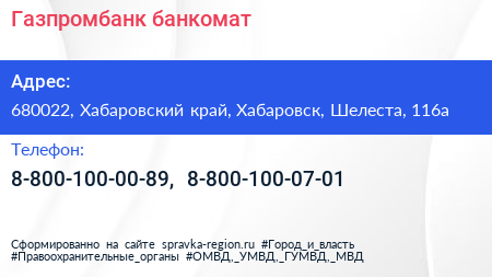 Газпромбанк, банкомат по адресу 680022, Хабаровский край, Хабаровск, Шелеста, 116а в дальнейшем Организация, размещена в следующих категориях: