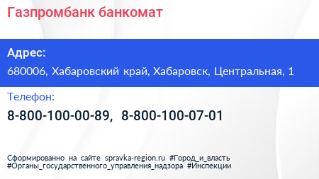 Газпромбанк, банкомат по адресу 680006, Хабаровский край, Хабаровск, Центральная, 1 в дальнейшем Организация, размещена в следующих категориях: