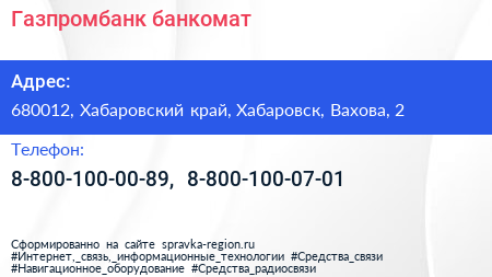Газпромбанк, банкомат по адресу 680012, Хабаровский край, Хабаровск, Вахова, 2 в дальнейшем Организация, размещена в следующих категориях:
