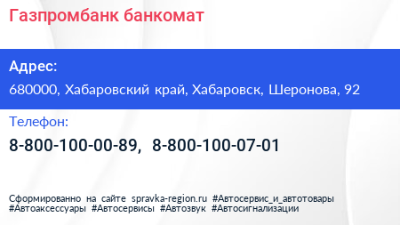 Газпромбанк, банкомат по адресу 680000, Хабаровский край, Хабаровск, Шеронова, 92 в дальнейшем Организация, размещена в следующих категориях: