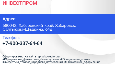 ИНВЕСТПРОМ по адресу 680042, Хабаровский край, Хабаровск, Салтыкова-Щедрина, 64д в дальнейшем Организация, размещена в следующих категориях: